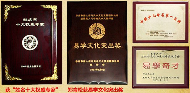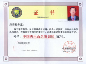 《中國易經協會》授予鄭青松 《中國杰出命名策劃師》 稱號,查看大圖>> |