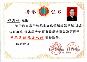 《全球易經文化協會》授予鄭青松 《世界易學命理創新行業先峰》稱號, 查看大圖>> |