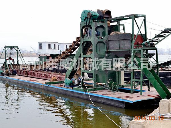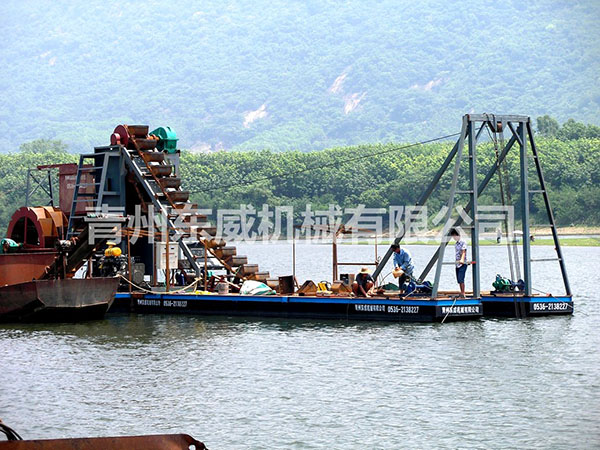 鏈斗式挖沙船可根據(jù)客戶性能要求及工礦作業(yè)特點設計制造。物料挖掘出來并由輸送機或輸送泵輸送至岸邊、運沙船的功能;浮體采用橫骨架式分體箱形結構,轉(zhuǎn)運時可拆裝后裝車。裝有定位設備、鏈斗挖掘裝置、橋架升降裝置及皮帶輸送機等。水下桿是由安裝在浮體上的絞車實現(xiàn)升降,砂石料通過鏈斗裝置挖掘上來,由輸送機或輸送泵輸送到岸上或運沙船。
