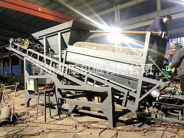 裝載機(jī)將砂石混合料鏟入料倉(cāng),物料經(jīng)料倉(cāng)流入滾筒篩內(nèi)進(jìn)行篩分,篩分后的沙子由輸送機(jī)輸送至料堆,鵝卵石通過(guò)滾筒篩溜到篩沙機(jī)尾部,一次性完成篩沙作業(yè)。